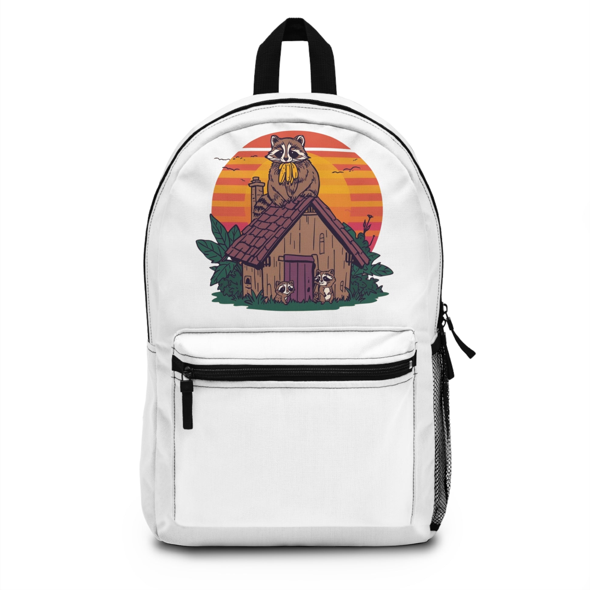 Adorable backpack featuring a design of a raccoon eating bananas with babies. Perfect for those who love whimsical and cute accessories. Ideal for students, travelers, hikers, and animal lovers. Great for back to school, camping, or everyday use.